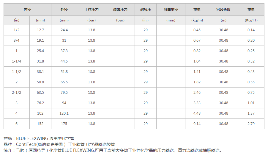 外層:藍色Versigard○R合成橡膠,帶有白色的螺旋狀纏繞帶(環裹壓?。?br/>工作溫度:-25°F to 150°F (-32°C to 66°C)